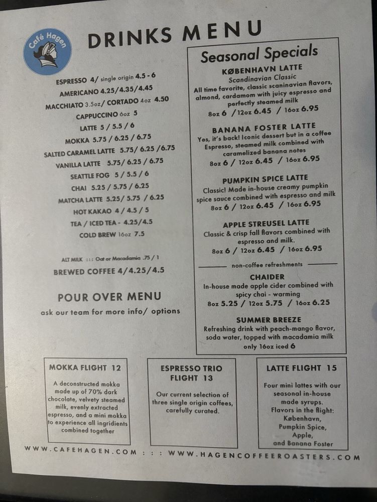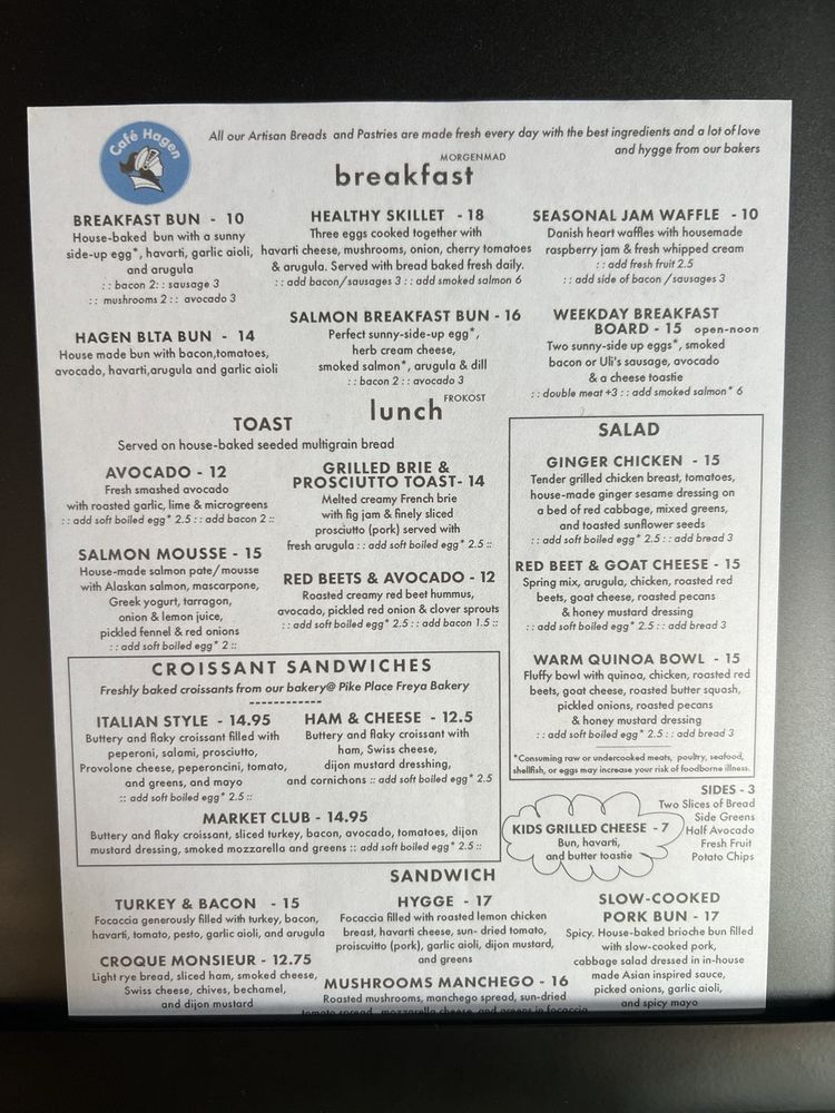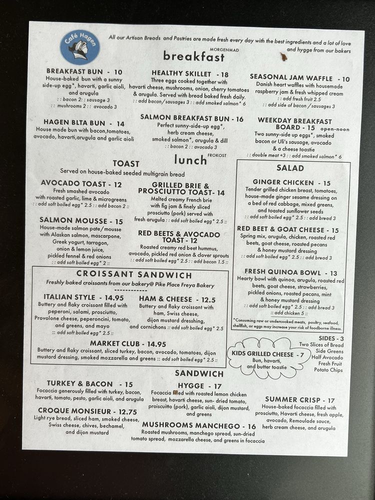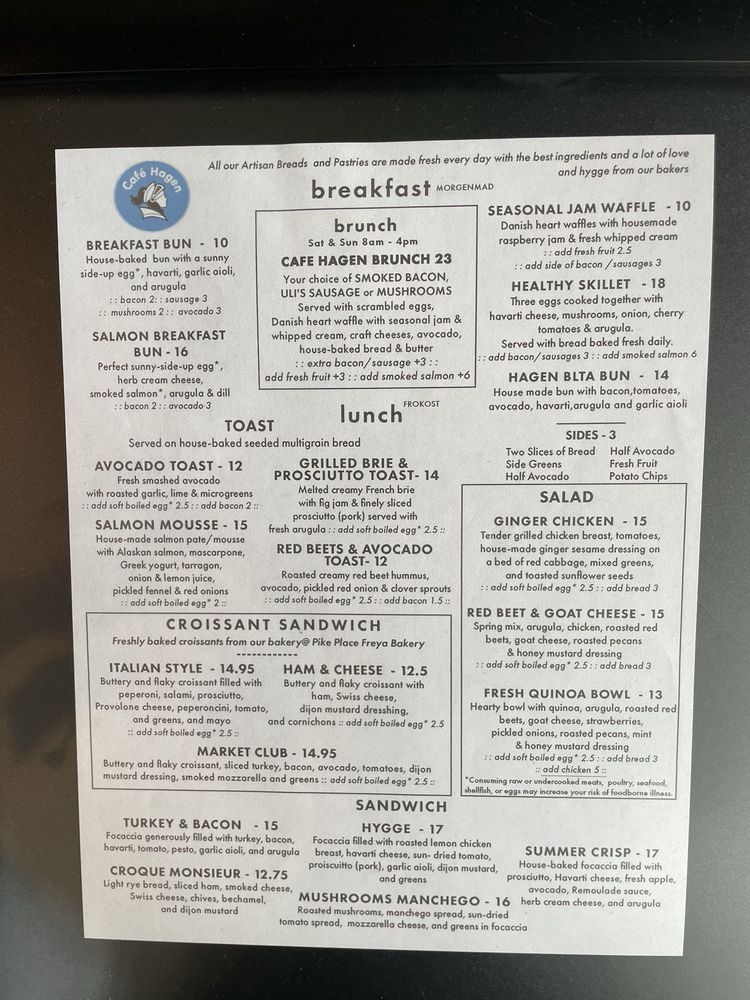 Café Hagen, located at 1252 Thomas St Seattle, WA 98109, is a trendy and classy café that offers a variety of options for breakfast and lunch. With a focus on sustainability, they provide plastic-free packaging and reusable tableware. This hipster spot caters to a diverse audience, as they offer vegan and vegetarian options, cater to gender-neutrality with their restrooms, and even allow dogs on their outdoor seating area. Their menu features delicious items like Overnight Oats and Fruit for breakfast and Salmon Toast for lunch, showcasing a combination of unique flavors and ingredients. The coffee selection includes favorites like Espresso and Cortado, perfect for pairing with their delectable dishes. Café Hagen is not just a café; it's a culinary experience that caters to both your taste buds and environmental consciousness.